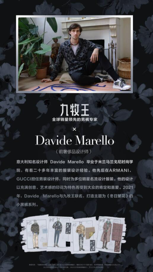 Davide Marello,毕业于世界顶尖设计学院之一的马兰戈尼,具有丰富的国际大牌工作经验。曾先后担任Armani、Gucci男装设计师多年,并成为意大利知名高端男装品牌Boglioli的首位创意总监,极其擅长设计富有艺术感的印花。本次合作的联名款小黑裤,融合极富浪漫气息的艺术印花和九牧王精湛制裤工艺,将复古典雅的印花与现代裤装廓形创意混搭,实现品质与艺术性的完美结合,带来崭新视觉同时,让优雅绅士风度尽情绽放。