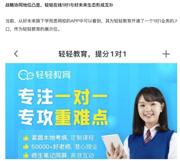 这份报道中提及:“好未来仅对内部业务开放的教研云,也对轻轻进行了开放。这使得轻轻可以在教研云本身强大的教研基础之上进行二次研发;好未来的直播云也正成为轻轻教育底层的技术框架。