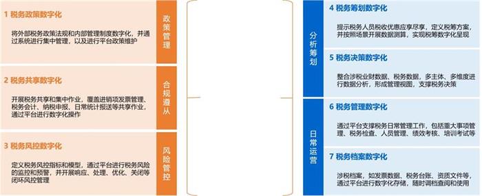 税务数字化转型主要体现在7个方面,分别为税务政策数字化、税务共享数字化、税务风控数字化、税务筹划数字化、税务决策数字化、税务管理数字化、税务档案数字化。