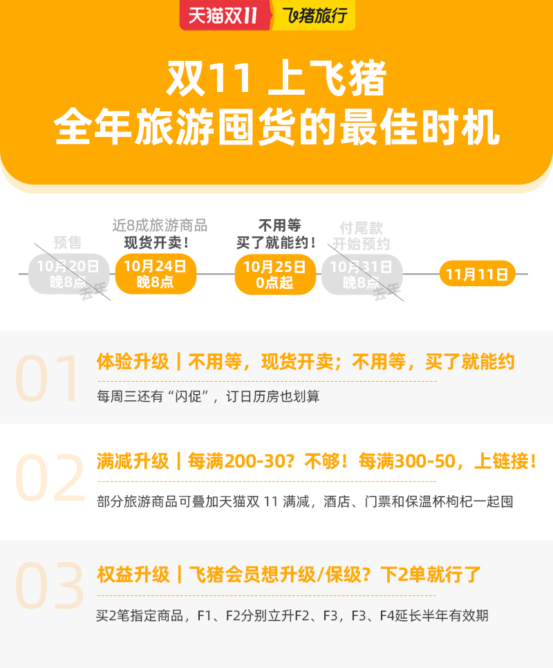 双11飞猪旅游商品现货开卖 25日零点起消费者即可预约使用 Posted on 2022年10月25日2022年10月25日 10月24日晚8点,双11正式启动,全年最火爆的旅游囤货季来了。飞猪表示,今年双11近8成旅游商品均为现货开卖,消费者无需经历付尾款等待期,并且从25日零点起即可直接预约使用。 (图:双11飞猪旅游商品24日晚8点开售) 今年旅游商品再次参与天猫双11的跨店满减,且优惠力度更大,活动商品享受跨店每满300减50,这意味着酒店套餐、乐园门票等旅游商品可以和秋裤、保温杯一起囤货,一起享受折上折。 包含免费接送机、免费机场贵宾厅等在内的飞猪会员权益持续加码。双11期间,飞猪F1会员、F2会员购买相应活动商品满2笔,即可分别升级到F2会员、F3会员;飞猪F3会员、F4会员购买相应活动商品满2笔,就能延长半年的会籍有效期。所有会员只要预约使用一个相应订单,还能再延长半年的会籍有效期。 值得一提的是,得益于飞猪会员“一卡通百卡”的权益,消费者双11期间在飞猪购买雅高、洲际等高星酒店的相应套餐商品并预约使用后,既可以累积房晚,还能获得酒店会员和飞猪会员的双重积分,部分酒店集团双11期间消费者还可快速升级金卡、铂金卡。 (图:双11旅游商品现货直接买、买了就能约) 旅游商品的丰富度也继续提升。飞猪工作人员介绍,随心飞、全国酒店通兑、景区乐园门票套餐等历年爆款如约回归,折扣力度更大。此外,今年还将推出酒店“随心住”、北京冬奥会赛场滑雪套餐、阳台上就能观礼发射的文昌“火箭房”等新品。 飞猪方面表示,截至目前许多爆款活动商品已迎来加购高峰期,接下来飞猪将加大服务资源投入,努力保障消费者的囤货需求和预约使用体验。 国内热点