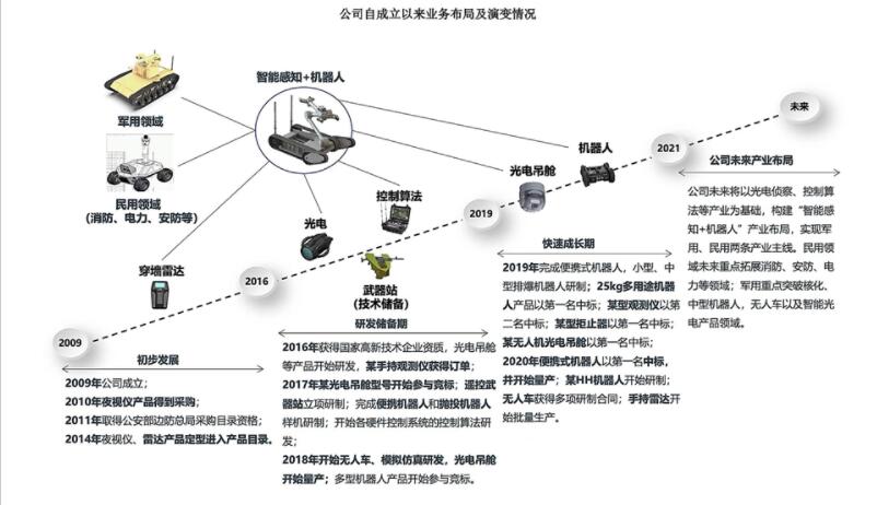 据招股书显示,公司主要业务目前集中于光电侦察设备和军用机器人两大核心领域,能够为客户提供整机、分系统或组件产品。光电侦察设备业务主要包括无人机光电吊舱、手持光电侦察设备、单兵夜视镜、手持穿墙雷达、光电压制/对抗产品等;机器人系统业务主要包括侦察机器人、多用途机器人、排爆机器人、军用无人车(重量大于1,000kg的地面机器人分类为无人车)、其他类型机器人及机器人组件/部件等。