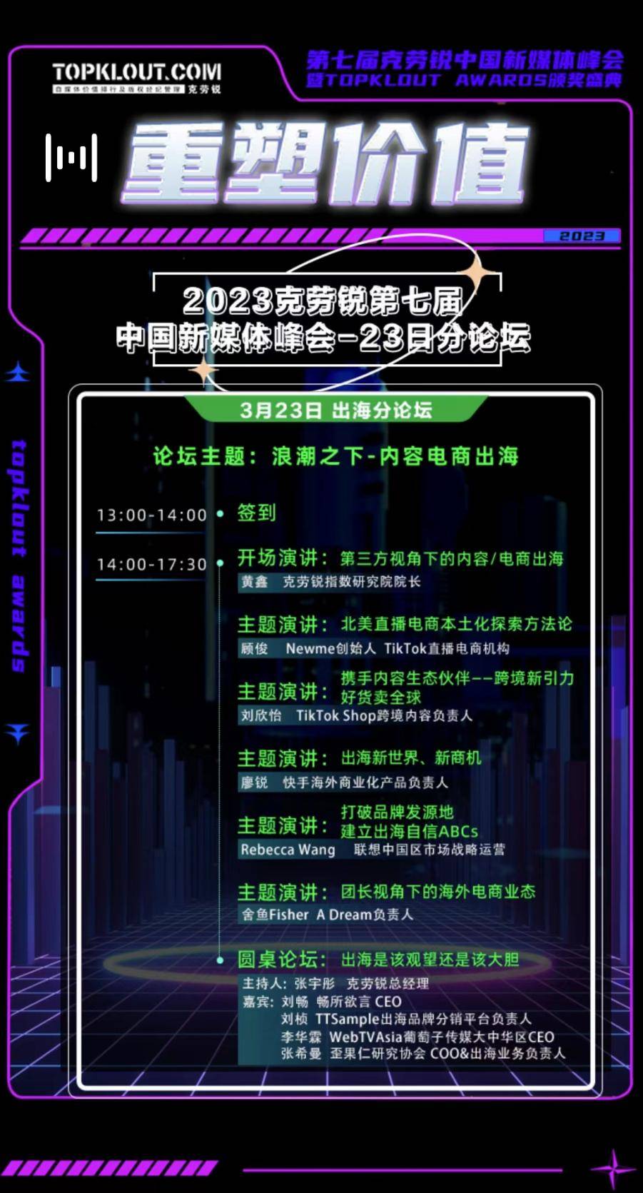 在该分论坛上,克劳锐指数研究院院长黄鑫将以“第三方视角下的内容/电商出海”为主题进行开场演讲。你还将会看到Newme创始人、TikTok直播电商机构顾俊带来的“北美直播电商本土化探索方法论”;TikTok Shop跨境内容负责人刘欣怡的“携手内容生态伙伴﹣跨境新引力 好货卖全球”主题演讲;快手海外商业化负责人廖锐带来的“出海新世界、新商机”;联想中国区市场战略运营Rebecca Wang、A Dream业务负责人舍鱼Fissher同样将围绕“内容电商出海”这个主题进行干货分享。