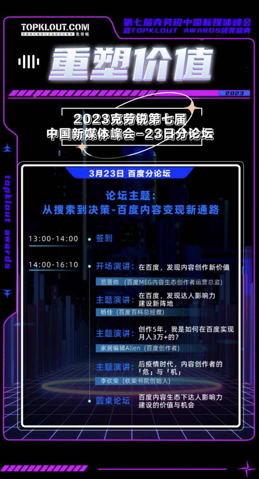 本届新媒体峰会在形式上有所创新,3月23日,克劳锐第七届中国新媒体峰会三个分论坛将同步开启,分别为:克劳锐出海分论坛“浪潮之下-内容电商出海”;百度分论坛“从搜索到决策-百度内容变现新通路”;“星之所向”快手磁力聚星专场。三个分论坛将从多个维度直观立体的呈现中国内容行业发展生态。