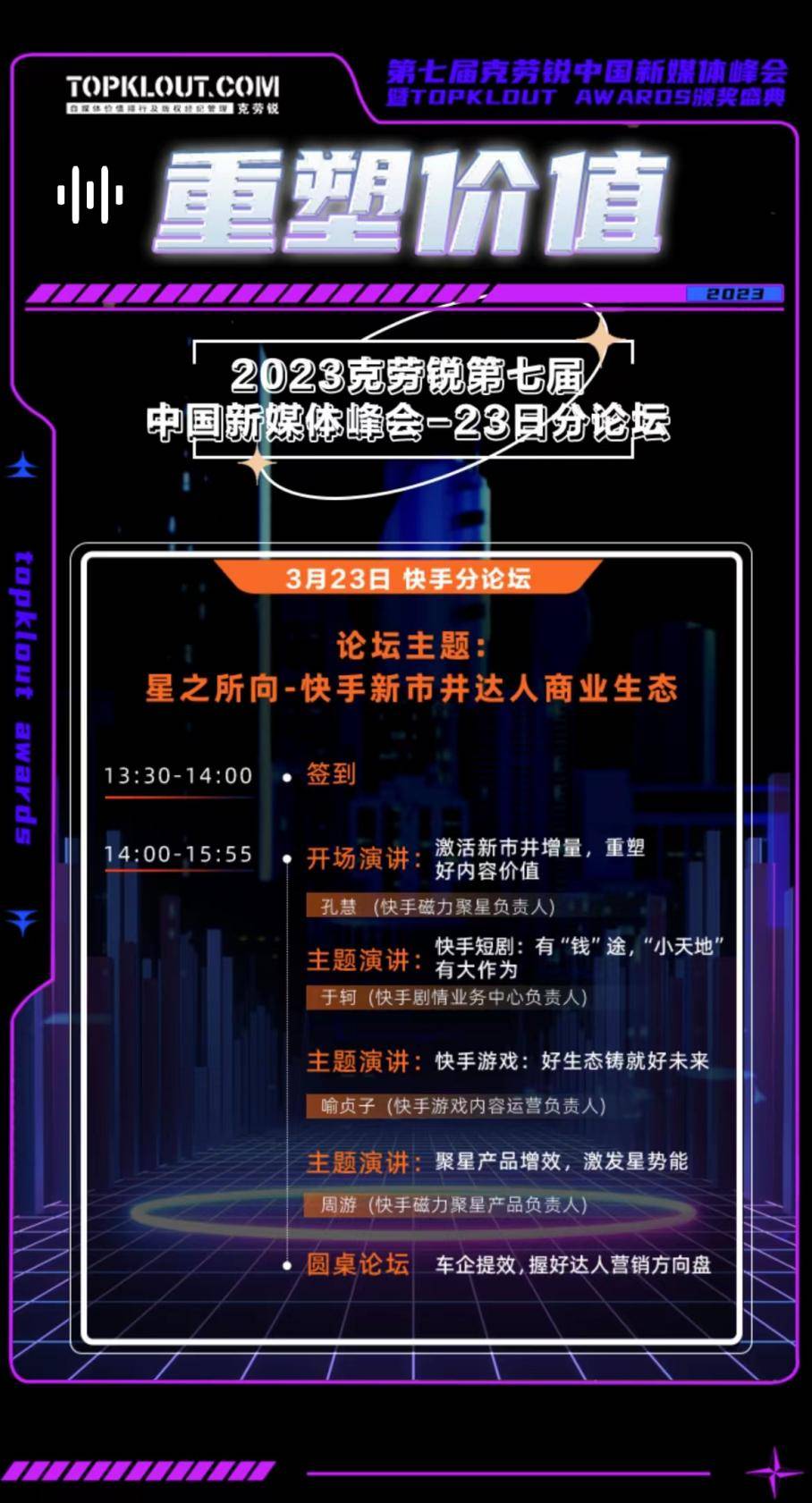 2023年克劳锐第七届中国新媒体峰会将于3月22日-23日在北京中国大饭店盛大开启,本届新媒体峰会以“重塑价值”为主题,邀请红人、平台、机构、品牌等内容产业各方角色,共同探讨内容行业未来发展趋势。