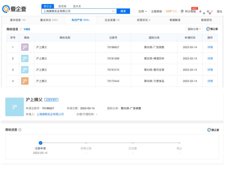 爱企查显示,沪上阿姨申请“沪上姨夫”商标 Posted on 2023年3月27日 据爱企查App显示,近日沪上阿姨关联企业上海臻敬实业有限公司申请多枚“沪上姨夫”商标,国际分类涉及广告销售、啤酒饮料、餐饮住宿、方便食品等,目前商标进度均为注册申请中。 值得注意的是,该公司此前已成功申请多枚“沪上姊妹”、“沪上女儿”、“沪上外甥”、“沪上祖母”等商标,国际分类涉及餐饮住宿,此前被网友戏称为“沪上一家人”。 国内热点