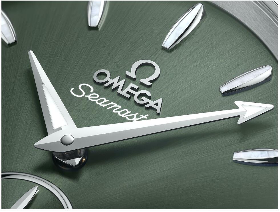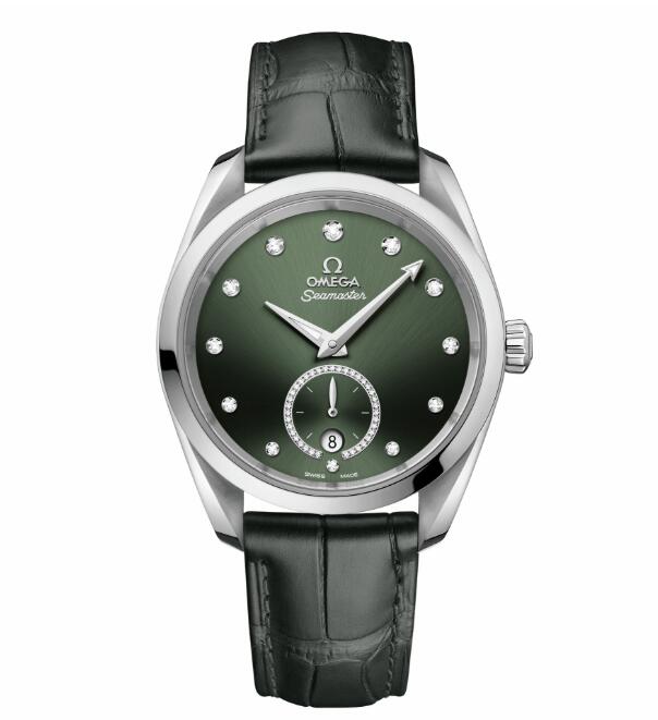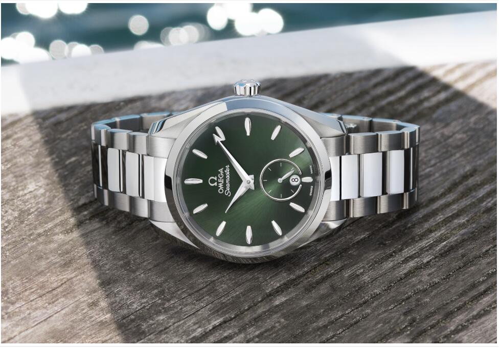 当然,对于许多年轻人来说,海马系列更加运动、更富现代感。这款海马系列AQUA TERRA 150米38毫米至臻天文台小秒针腕表显得与传统的海马有很大的区别,更加简洁干练。38毫米直径的不锈钢表壳采用对称设计,表背采用波纹边缘设计。醒目的深绿色表盘呈现出太阳射线打磨效果,6点位设有日历窗,小秒盘的圆环经过镀铑处理,并镶嵌钻石。镀铑指针覆有白色Super-LumiNova夜光涂层,依次递增的钻石小时刻度镶嵌于镀铑托槽内。该表搭配深绿色皮表带,与盘面搭配和谐。内部搭载的欧米茄8802同轴至臻天文台机芯,通过由瑞士联邦计量研究院(METAS)核准的至臻天文台认证,其精准度、防磁性和整体性能均达到行业的更高标准,特别地实用。