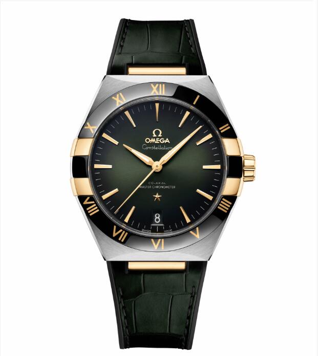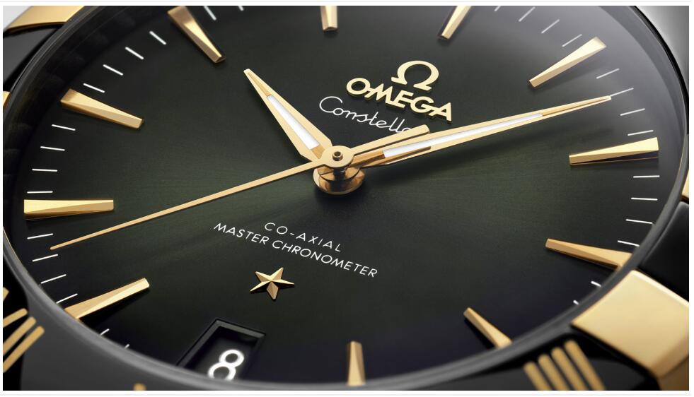 记得多年之前,曾经对一款盘面黑中泛绿的古老欧米茄星座有过浓厚的兴趣,当时对它的状态有点犹豫,结果没有买下。当我看到这款新星座系列41毫米至臻天文台,钢壳配上抛光黑色陶瓷表圈以及粗壮的黄色18K金「托爪」,让人看到了星座的全新面貌。绿色表盘呈现出太阳射线打磨效果,偏深的配色,给人稳重而温暖的感觉。由OMEGA Ceragold®技术制成的罗马数字时标,以及同样金色的时分秒三针,在绿色盘面的衬托下显得格外醒目。