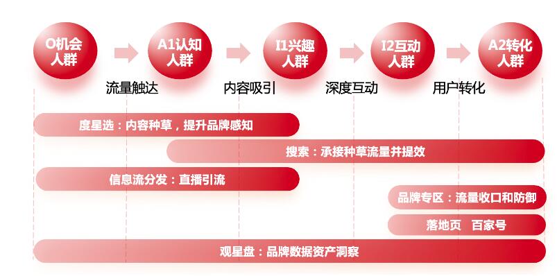 基于以上洞察,百度营销提出了“度星选内容种草+效果产品承接,聚焦提升I2人群”的总策略,以差异化产品布局承接不同阶段人群需求。前期锚定财经相关,通过度星选进行内容种草,提升品牌感知,再通过信息流分发的方式引流到内容;后期通过搜索承接种草流量,品牌专区则作为流量收口和防御要塞。