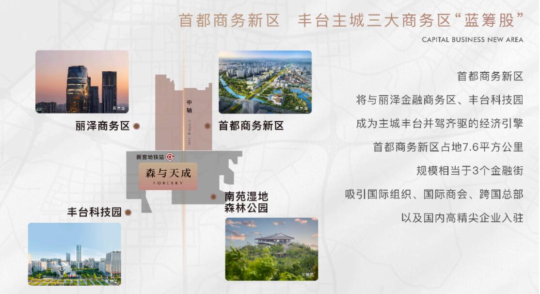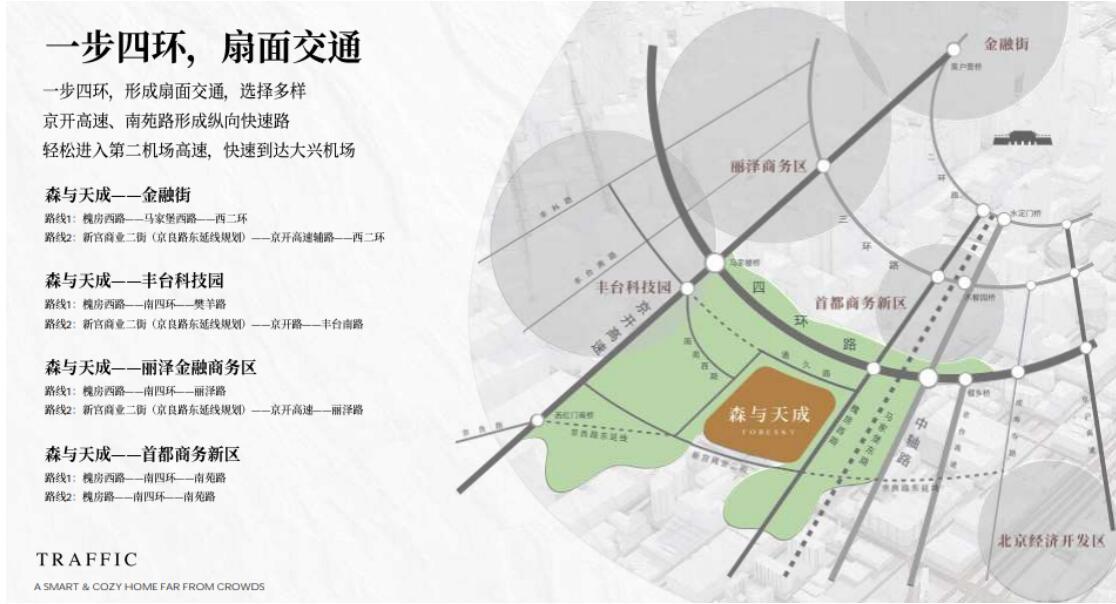 京城四环、土地稀缺,寸土寸金。而京投发展森与天成距离南四环直线距离约1公里、首都商务新区直线距离约3公里,丰台科技园直线距离约4公里,丽泽金融商务区直线约5公里,堪称四环“城心”、多个核心商务区的“后花园”。