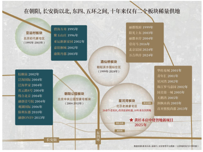 在朝阳,长安街以北、东四五环之间是一个黄金区域,分布着大量老牌和新晋豪宅区。据了解,过去10年间,该区域公开出让的地块极为有限,仅两宗板块有供应:一个是2024年屡次打破豪宅市场记录的北京宸园所在的酒仙桥,一个便是这里。而星河湾板块本身,也有十年未供地。“双十年”维度断供的土地再次启封,其稀缺价值不言而喻。