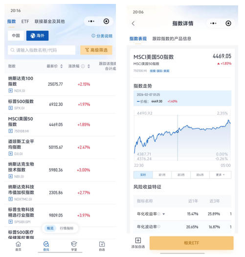与此同时,“指数直通车”优化了交互体验,在“查找”专区的指数列表页中新增“中国”、“海外”两个分类按钮,根据所覆盖的市场范围,“中国”包含A股及港股指数,“海外”为除A股及港股外的其他市场指数。用户可通过切换分类,查看对应市场的指数情况,也可点击单个指数进入详情页了解其走势及风险收益特征等信息,辅助投资判断。